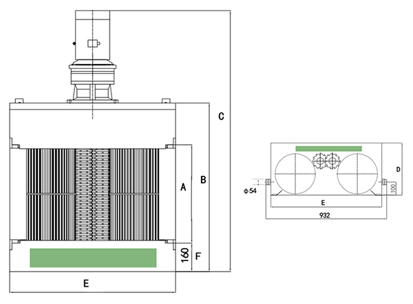 | 型号 | A | B | C | D(箱厚) | E(箱宽) | F | Q(m³/h) | N(kw) |